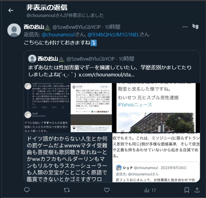 結局暇空はデマってことで片付いたのかな?まあそこは私には判断できないから置いておくとしても、シュナムルはトランスイデオロギー振り翳して女に説教するやつだし、強姦魔マギー(ヒスブルナオキ)を庇った過去も消えないからなあ。 https://t.co/CnfDju6iJ1